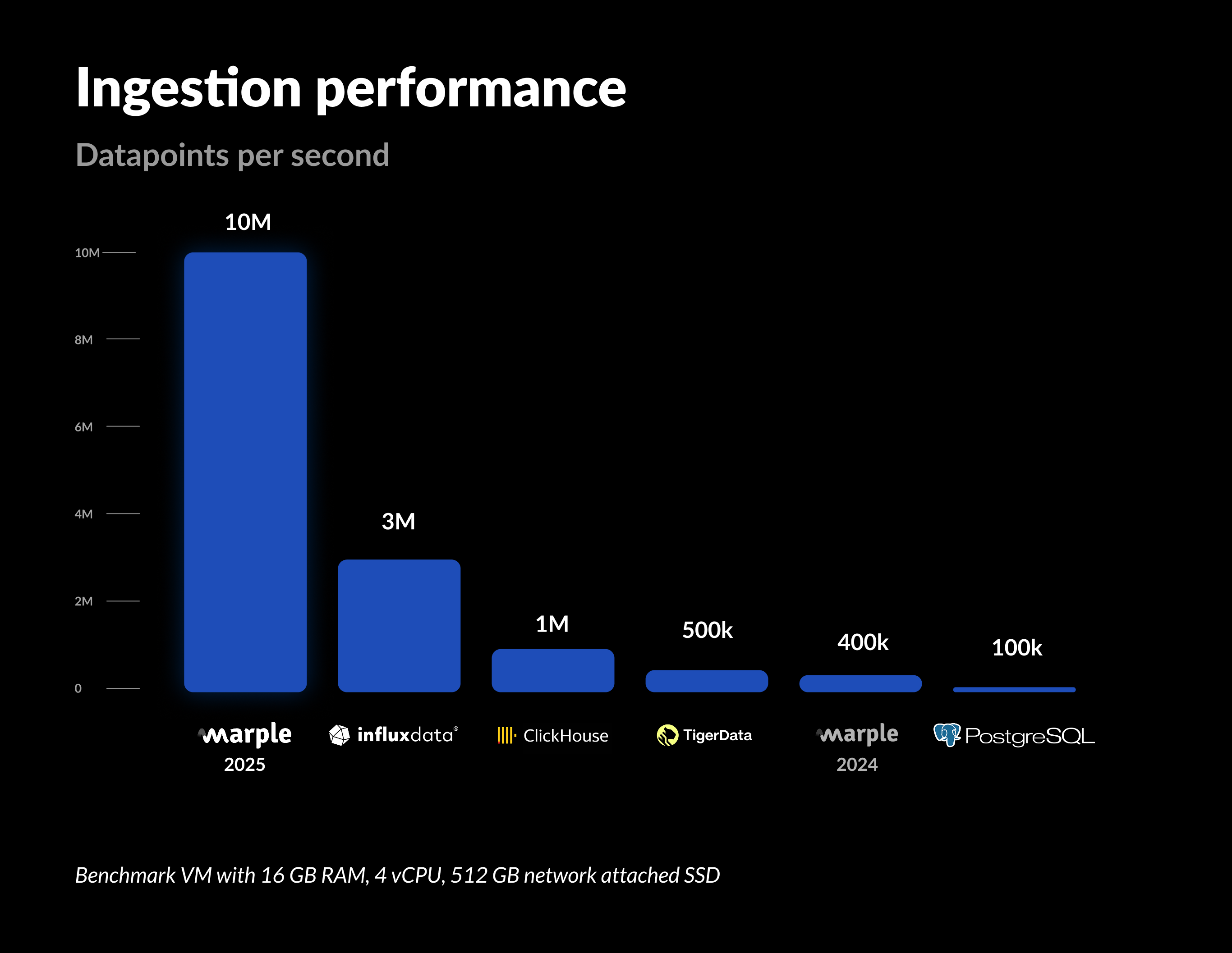 Read the SDK documentationMarple DB is purpose-built for high-frequency telemetry data, handling measurements from 1Hz to 10kHz or more. Optimized for hundreds or thousands of sensors, it ensures fast, ad-hoc querying through a PostgreSQL layer enhanced with clever data segmentation for seamless scalability.