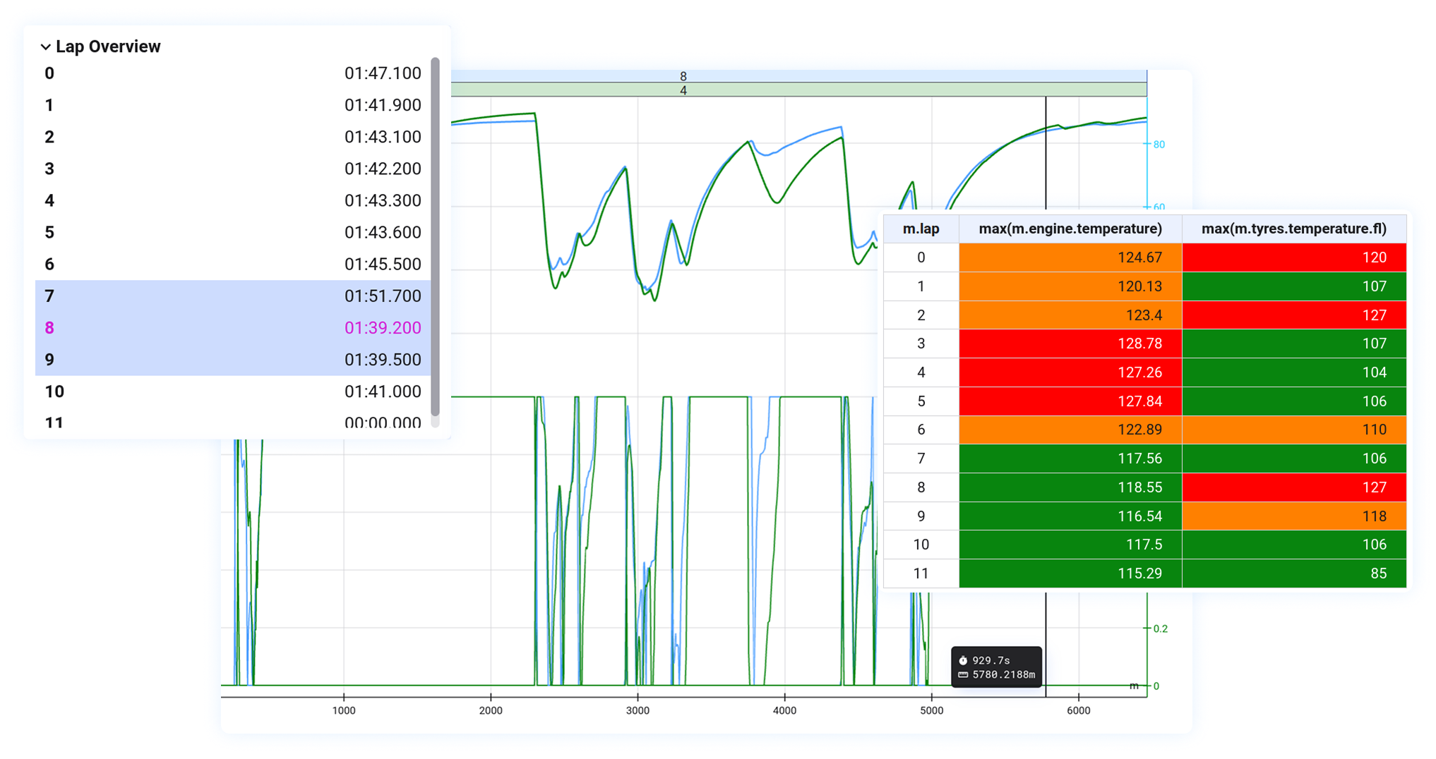 Calculate aggregate metrics for each lap and colour them based on conditional formatting.