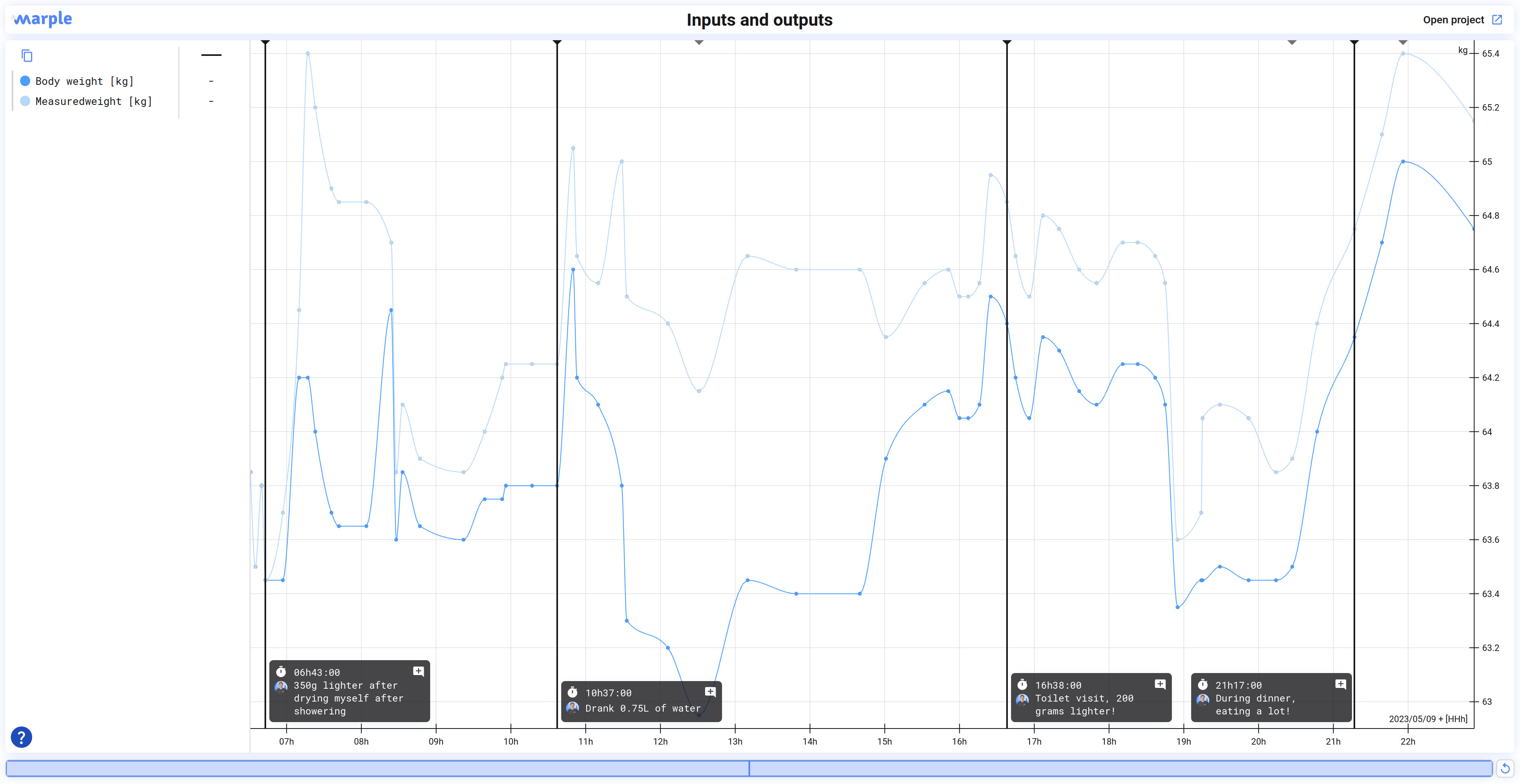 The most common inputs are food and drink. I had three meals, and drank a lot of water during the day. At 06h35, I took a shower, making me "gain" 300 grams of weight. At 10h37, I drank 0.75 liters of water.