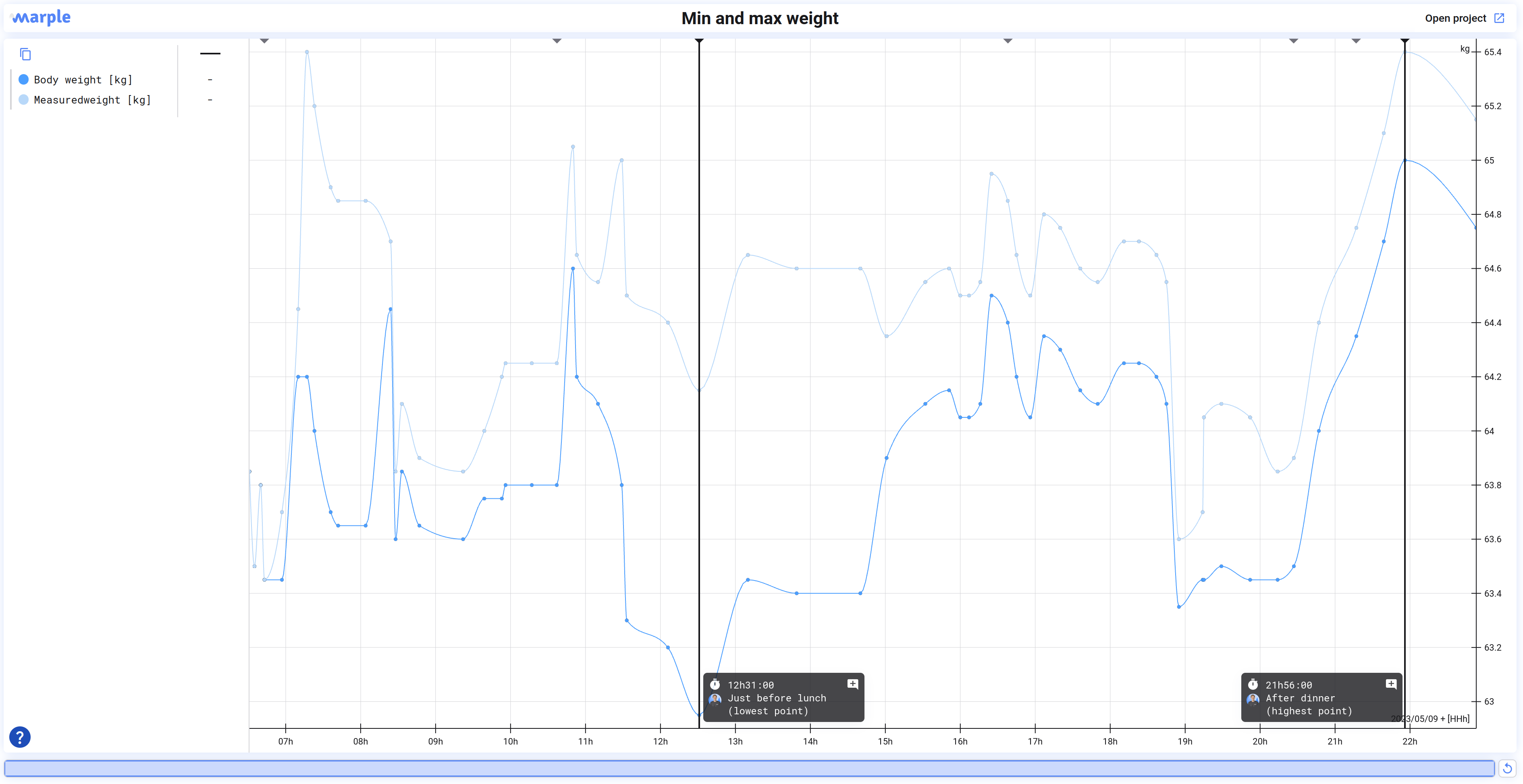 The maximum weight is 65.00, the minimum 62.95. That is a 2.05 kg (4.52 lb.) difference between these two extreme points! Surprisingly, the minimum weight was not when I woke up (63.85 kg), but just before lunch at 12h31. The maximum was at 21h56, just when I finished the last chocolate as dessert.