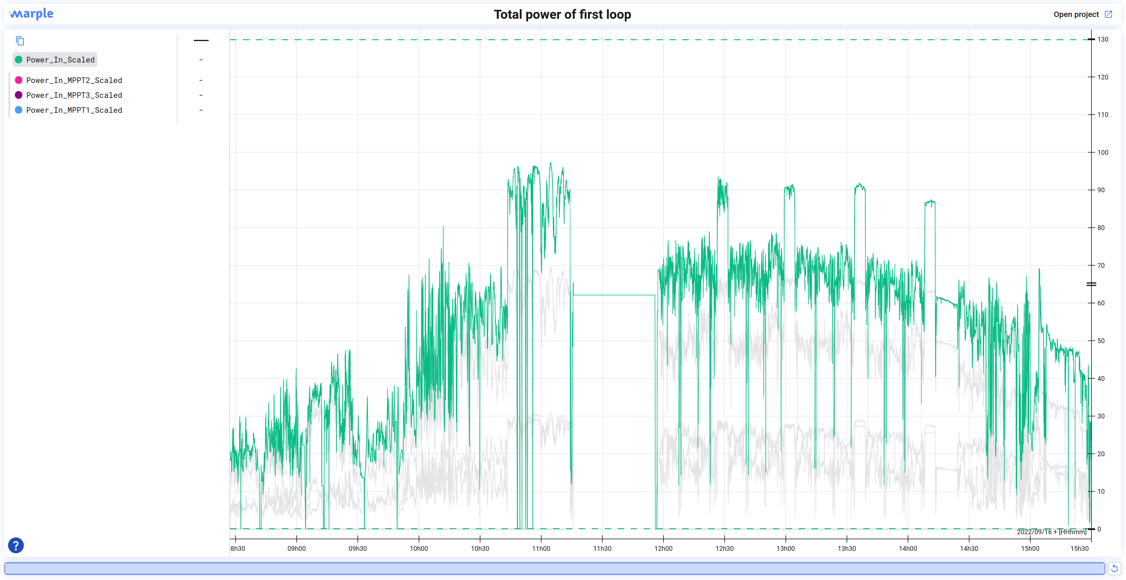 The solar panel that is mounted on top of the car, consists of 3 strings. These are a bunch of solar cells placed in a series, to collect as much energy as possible. These 3 strings are all passed to our MPPT system, which stands for Maximum Power Point Tracking system. The power is logged separately for each string, as well as the total power: